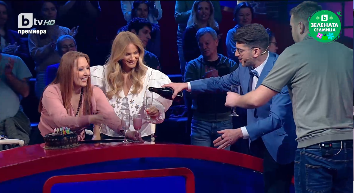 Към наздравиците в шоуто по бТВ се присъединиха също съотборничката на рожденичката Зейнеб Маджурова, и другия отбор, който включваше капитана Христо Пъдев и актьора и режисьор Ивайло Ненов.