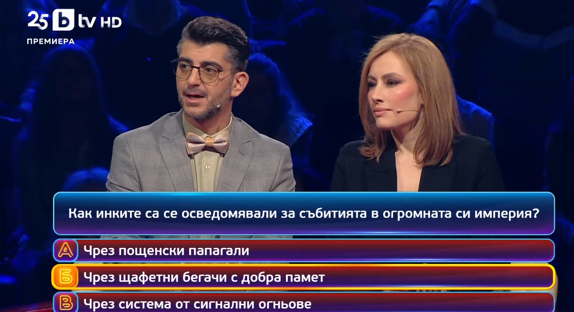 Лили му благодари, но и успя да го убеди да заложат на отговора, който включваше щафетни бегачи с добра памет. Сашо я послуша и това донесе 600 лева на Лили и Милица.