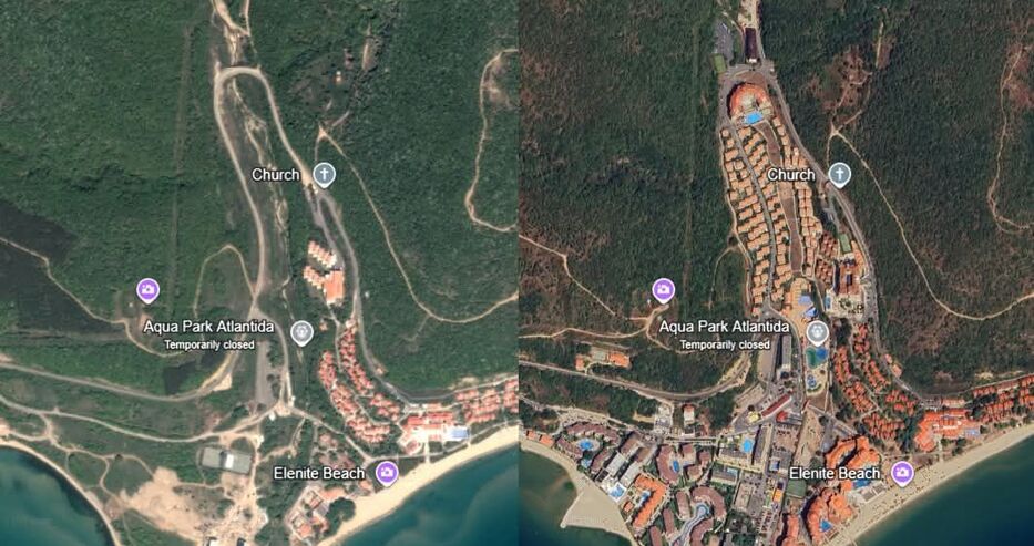 Сателитни кадри от 2003 и 2024 показват как е строено на Елените