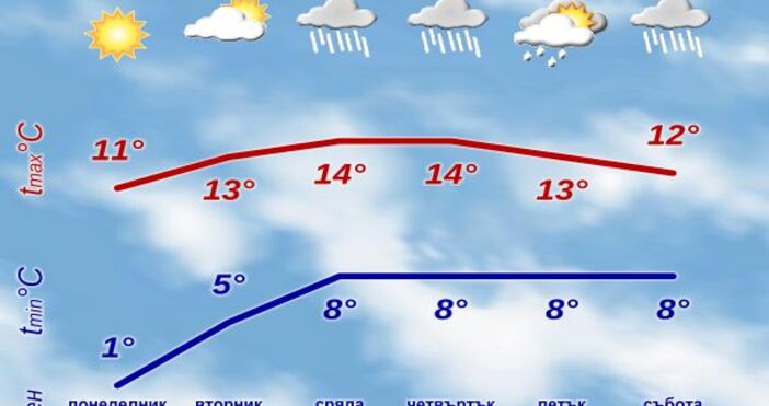 В сряда и четвъртък, под влияние на средиземноморски циклон, ще бъде облачно с валежи от дъжд. Има повишена вероятност в отделни райони валежите да са временно интензивни и значителни по количество. Вятърът ще остане слаб, в източните райони - умерен от юг. Температурите ще са с малък дневен ход, от 5°-6° в северозападните до 16°-18° в югоизточните райони.