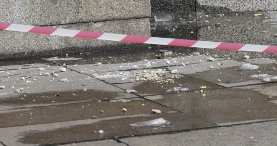 Част от мраморна облицовка падна вчера върху мъж, преминаващ край сградата. Пострадалият е със счупен крак и наранявания по главата
