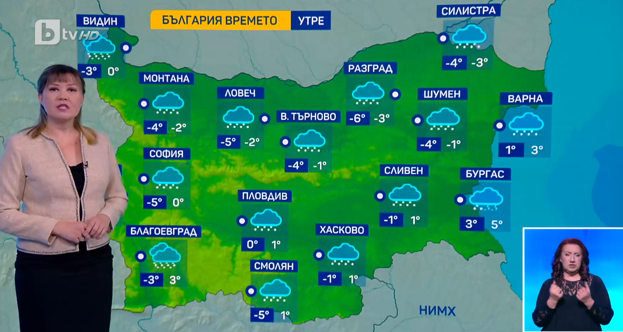 През следващото денонощие и в сряда все още ще има снеговалежи, предимно в източните райони. След това вече няма да вали, но ще бъде много студено, с температури под нулата през целия ден, а сутрин са възможни стойности и дори и докъм минус 20 градуса, заяви по бТВ Станислава Цалова.