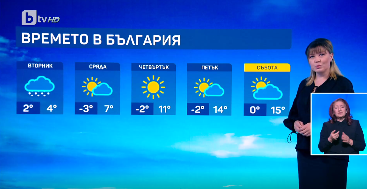 Сутринта обаче ще бъде много студено, с минимални температури от минус 6 до минус 1, а в повечето райони на отделни места са възможни и по-ниски от тези стойности.