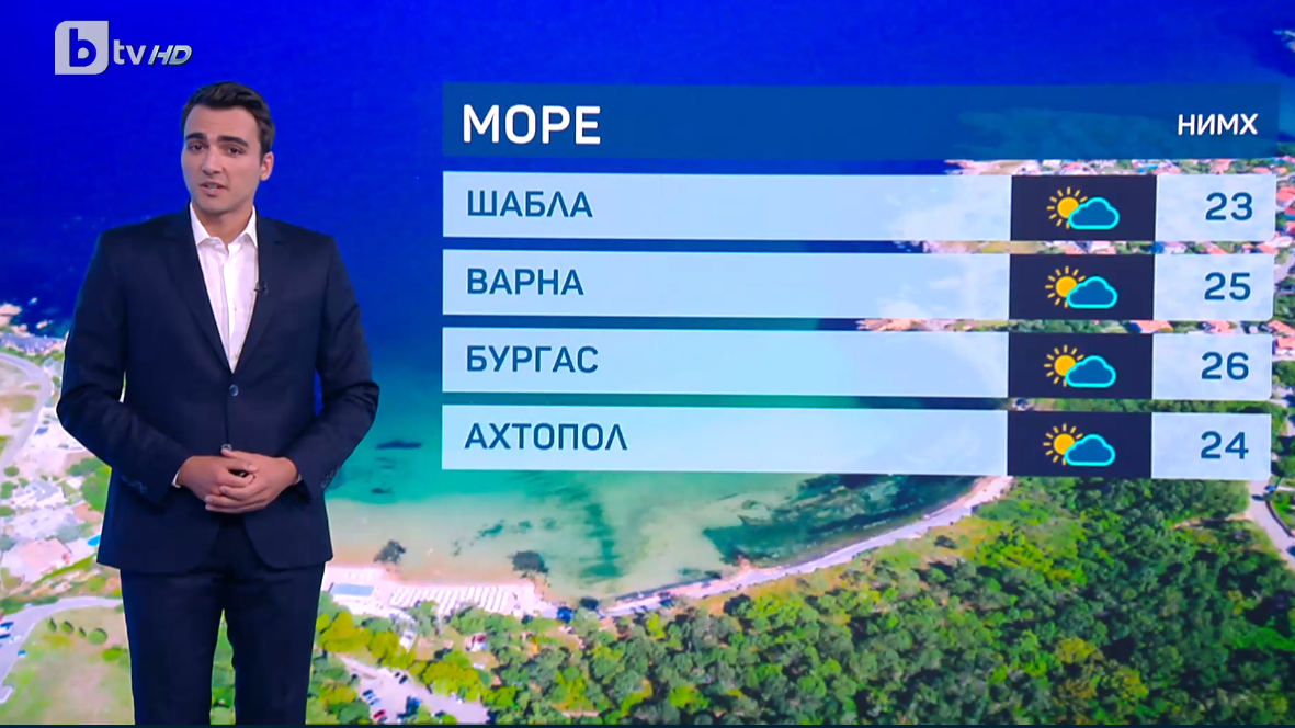 По Черноморието въпреки предимно слънчевото време, температурите ще са по-ниски от останалите райони, и очакваме стойности между 22 и 26 градуса. Температурата на морската вода ще е между 17 и 20 градуса.