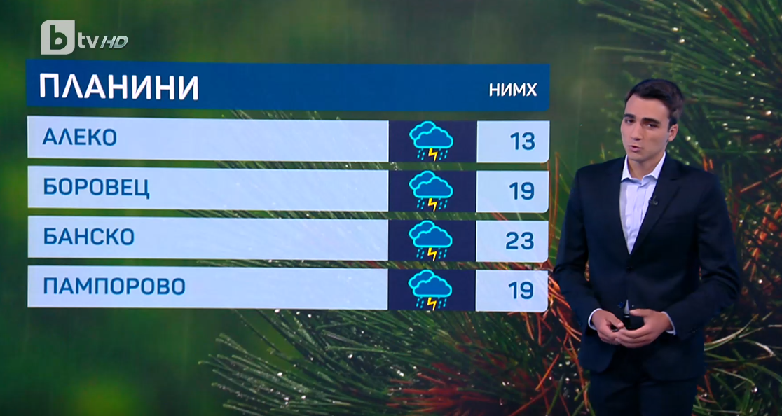 Предимно слънчево време се очаква и по планините, но отново предстои увеличение на облачността. На места ще превали краткотраен дъжд, придружен с гръмотевици.