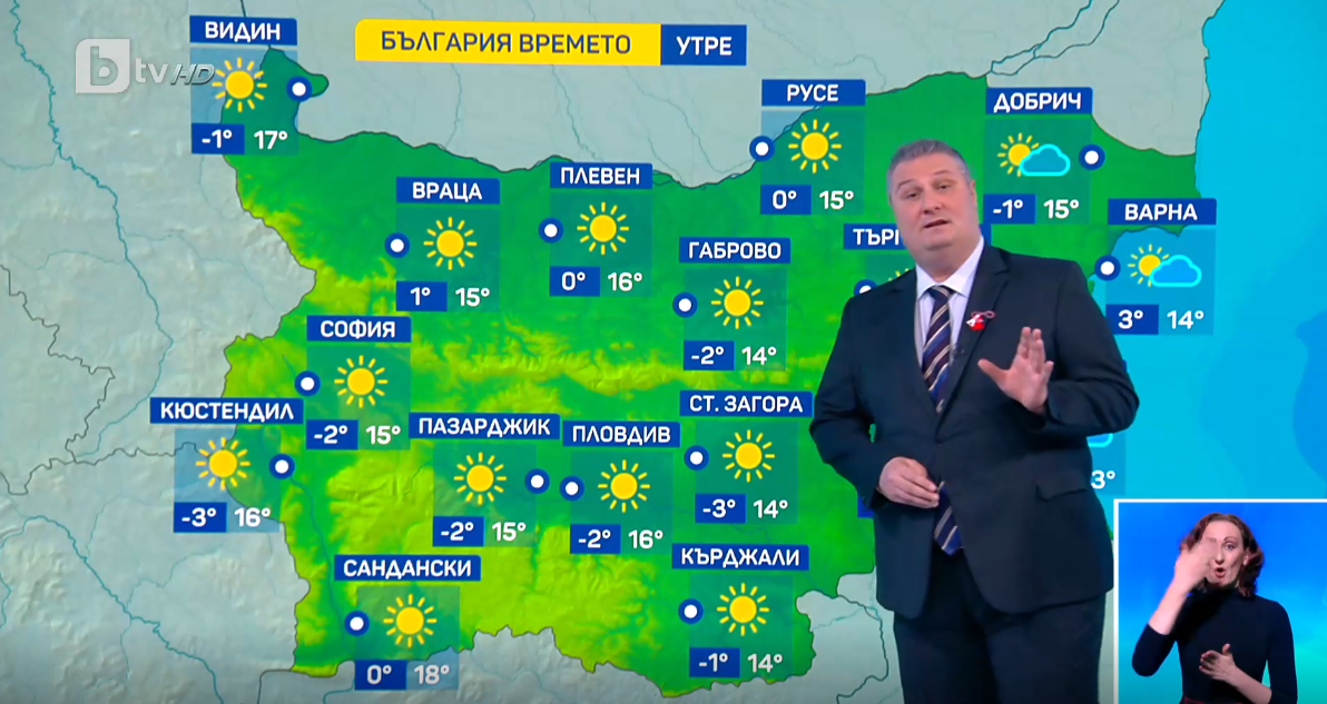 Утре ни очаква още един слънчев ден, с малко по-високи температури от днес. Максималните ще бъдат между 13 и 18 градуса, а в София около 15. В Пловдив живакът ще удари 16, а във Варна – 14.