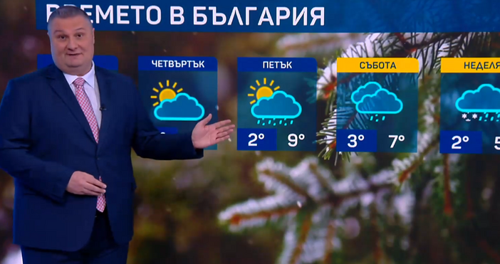 Температурите ще достигат 9-14 градуса, а в петък слабо ще се понижат. Ще има превалявания от дъжд над Южна България, а в планините и от сняг. Към събота дъжда вече ще е на повече места в страната, а в неделя най-вече над Северозападна България и в западните области заради застудяването дъждът ще премине в сняг, и там ще се образува снежна покривка.