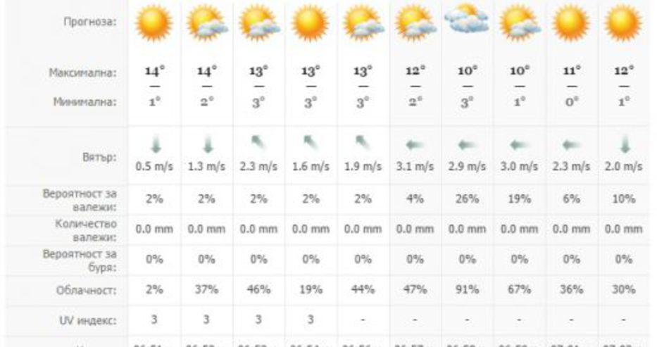 Слънчево ще е и над планините, където ще духа слаб вятър, по Сторопланинското било - и умерен, от север. Максималната температура на височина 1 200 метра ще достигне 12 градуса, на 2 000 метра ще е около 6°. Валежи не се очакват.