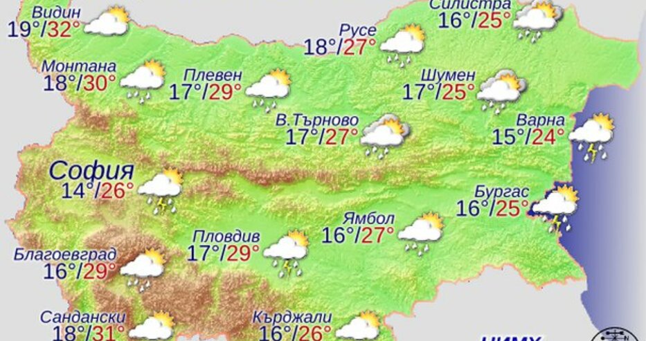 В неделя преди обяд ще преобладава слънчево време. След обяд отново ще се развива купеста и купесто-дъждовна облачност, ще има краткотрайни, на места интензивни валежи от дъжд с гръмотевици. Ще има условия за градушки и временно усилване на вятъра. Ще духа до умерен вятър от запад-северозапад. Максималните температури ще са от 24°-26° в източните до 29°-31° в западните райони от страната.