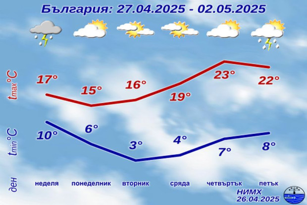 В четвъртък и петък след обяд ще се развива купеста облачност, вероятността за следобедни валежи през втория ден се повишава. Минималните температури ще бъдат между 6° и 11°, дневните ще надхвърлят 20°.