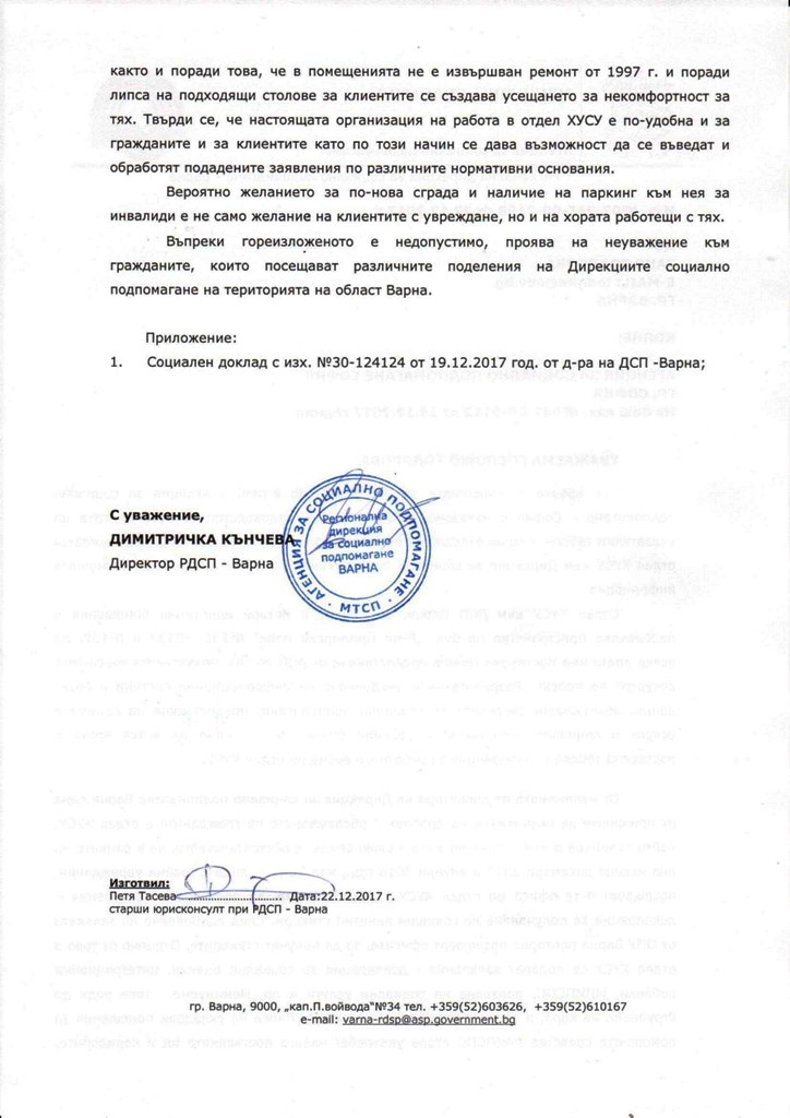 Отговорът от Димитричка Кънчева, директор на Регионалната дирекция „Социално подпомагане“ е по-общ и в него се казва, че указателни табели са били поставени като част от европейски проект. В него също така се признава, че сградите не са ремонтирани от миналия век, по-точно от 1997 г., като се посочва също, че желанието за по-добри условия не е само на клиентите с увреждания, а и на служителите.