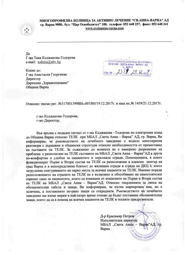 Изпълнителният директор на МБАЛ „Св. Анна“ - Варна д-р Красимир Петров признава, че лечебното заведение многократно е поставяло проблема пред държавните и общинските структури, но уви – без резултат до момента. По повод сигнала на г-жа Тодорова, че на мястото няма дори табели и маркировка, той обещава откраднатите знаци да бъдат възстановени „в най-скоро време“.