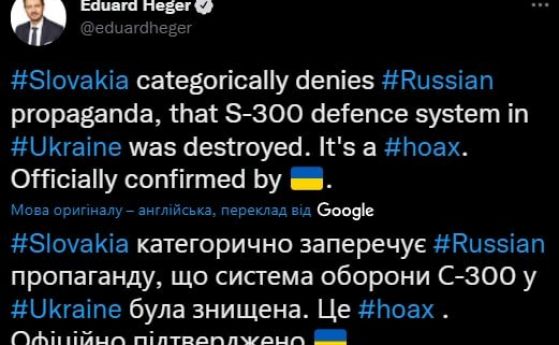 "Словакия категорично отхвърля руската пропаганда, че отбранителната система С-300 в Украйна е била унищожена. Това е измама. Официално потвърдено от Украйна", пише той.