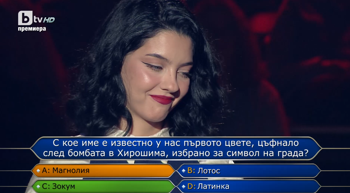 Изабел обаче се затрудни при въпроса за 10 000 лева: С кое име е известно у нас първото цвете, цъфнало след бомбата в Хирошима, избрано за символ на града?, с опции Магнолия, Лотос, Зокум и Латинка.