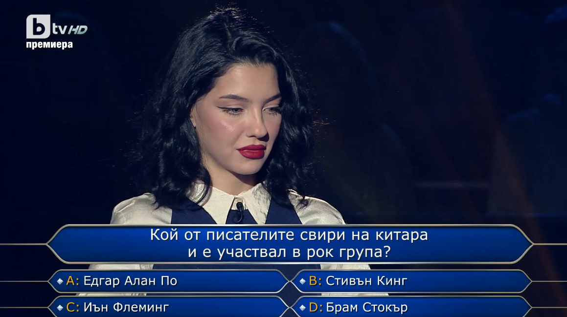 За нея бе попитана: Кой от писателите свири на китара и е участвал в рокс група? – Едгар Алан По, Стивън Кинг, Йън Флеминг и Брам Стокър.