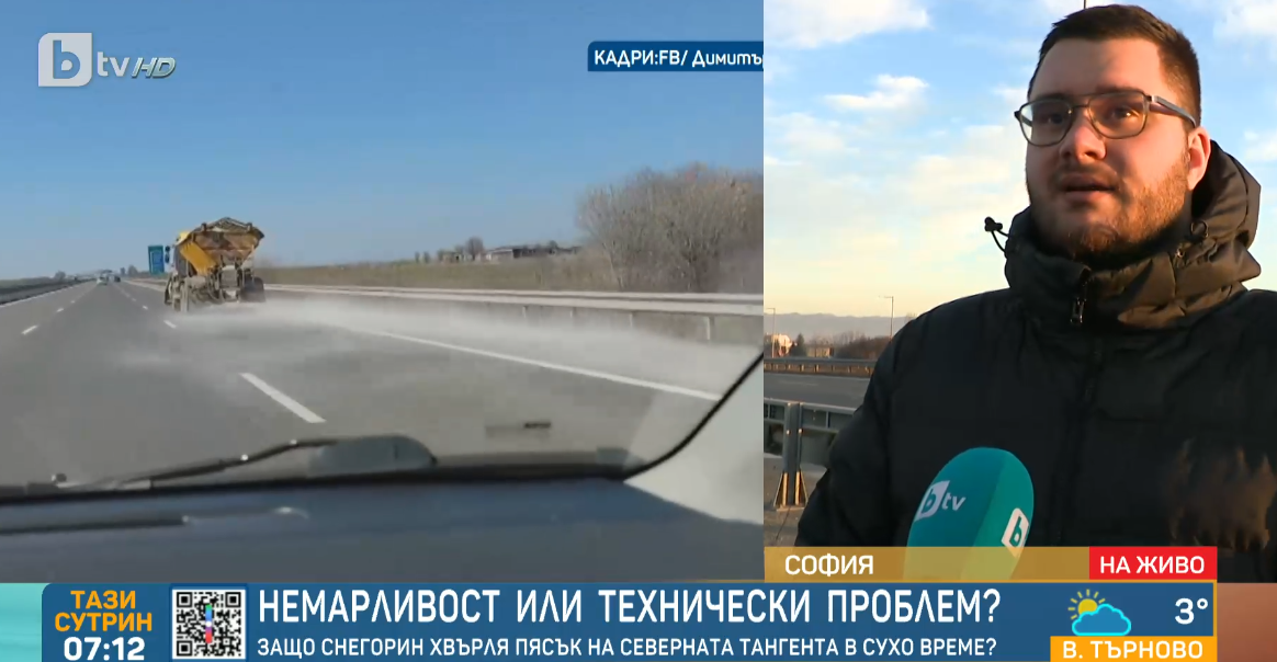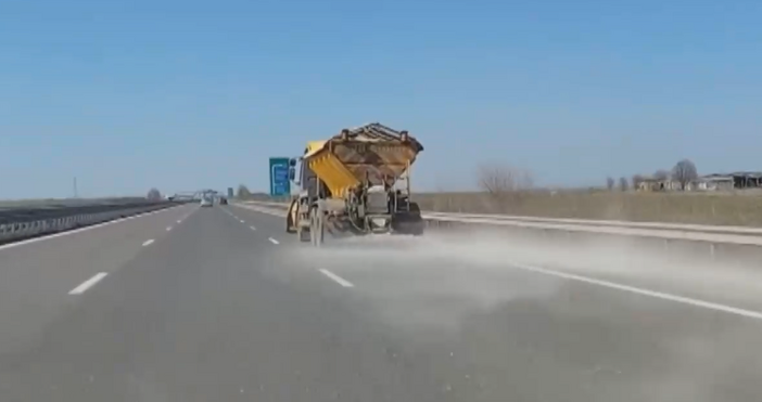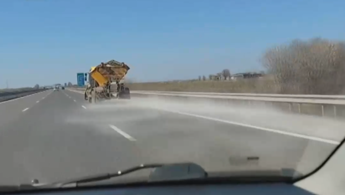 При слънчево време и температура от 15 градуса, и без снят на пътя, той бе опесъчен от снегорин срещу заледяване.