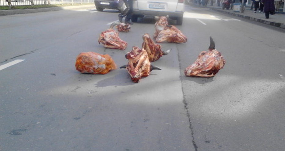 Жестока гледка стресира минувачате на една от най-оживените пешеходни пътеки в центъра на Варна. Няколко отрязани и одрани телешки глави се търкулнаха на платното на бул. „Осми Приморски полк“ пред очите им днес по обед. За кървавата гледка е виновен бус, чиято задна врата се отворила в движение. Товарът изпаднал от каросерията, но за щастие инцидентът бил забелязан бързо. Водачът на буса бързо събра стоката, информира наш читател, който засне случилото се. За щастие, разсипаните животински глави не са предизвикали паника на пътя и катастрофа.