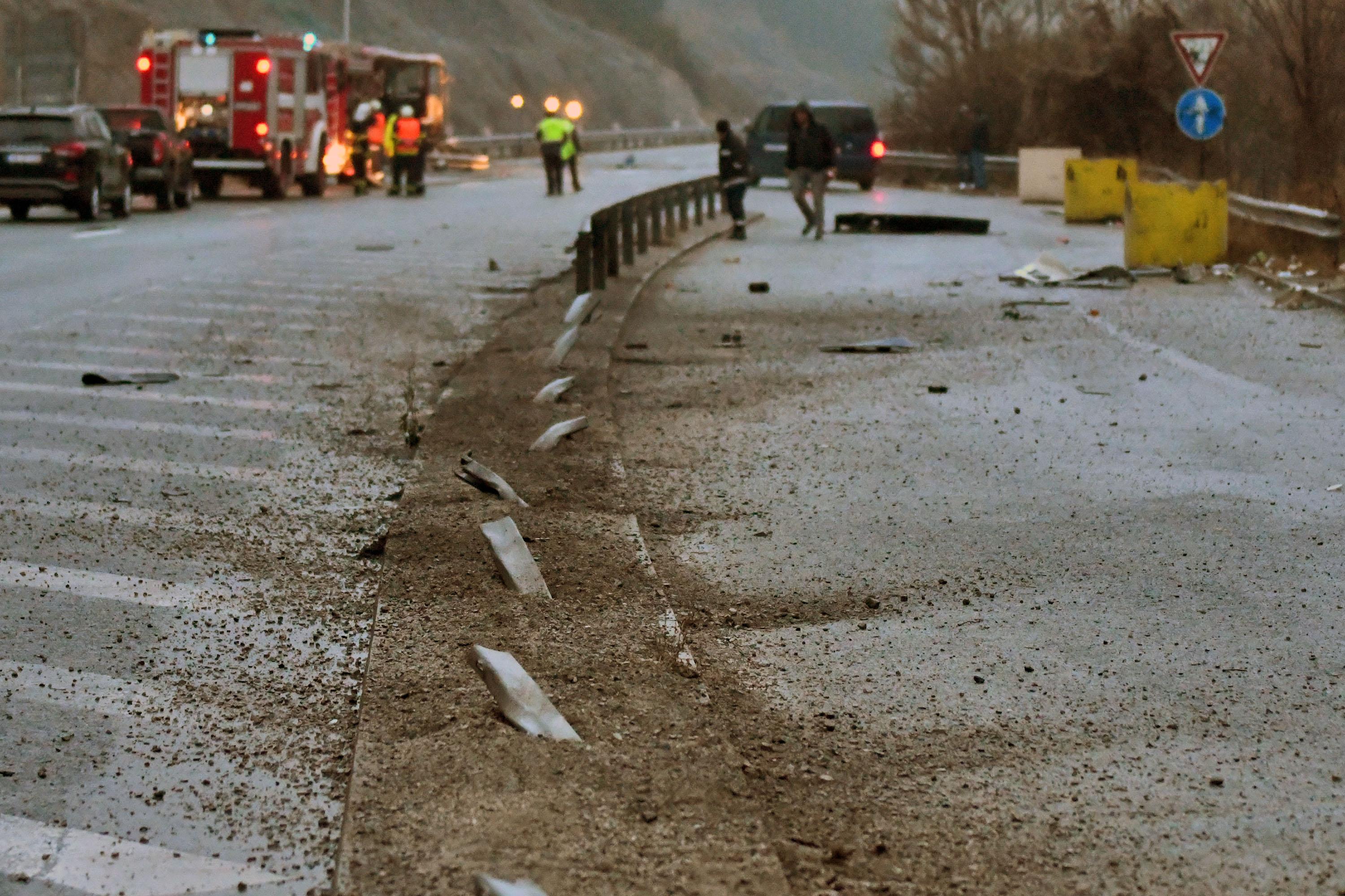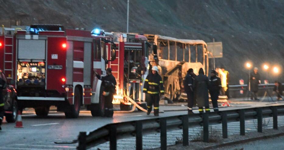 45 са загинали при ужасен инцидент на автомагистрала "Струма". От снимки на агенция Булфото се виждат тежките поражения по автобуса, който се е запалил.