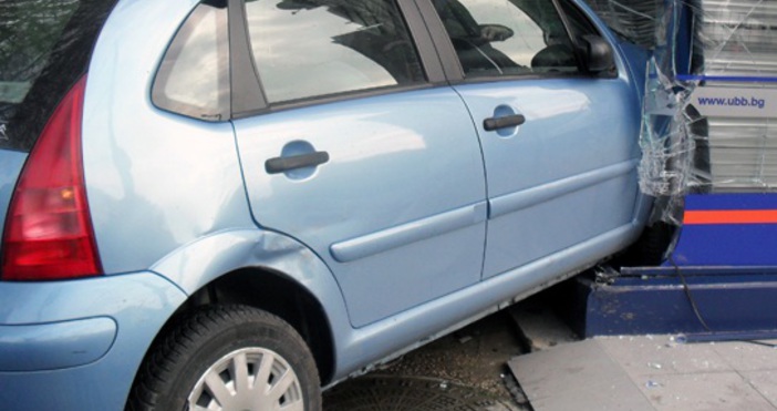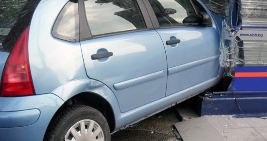 Както "Петел" първо съобщи, зрелищна катастрофа стана на кръстовището на „Пирин” и "Сливница" днес в 9,20 часа. "Ситроен", който се е движел по бул. „Сливница” посока центъра, се удря с изскочил от „Дрин” пикап. Вследствие на удара водачката на Ситроена губи контрола върху колата, занася се наляво, чупи прозорец на ОББ и се кротва в банката. Стъклата са потрошени, а едно парче от тях се забива в предния капак на колата. На място идва КАТ и след взетите две проби за алкохол, тази на шофьора на пикапа се оказва положителна. Дрегерът отчита 1,26 промила и той е откаран в болница за кръвни тестове.