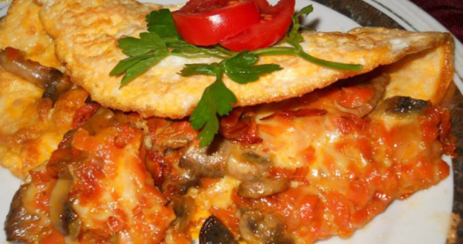 Преди да свалите съда от огъня, добавете сиренето Едам. В подходящи чинии сложете омлетите, добавете от плънката, загърнете и гарнирайте.