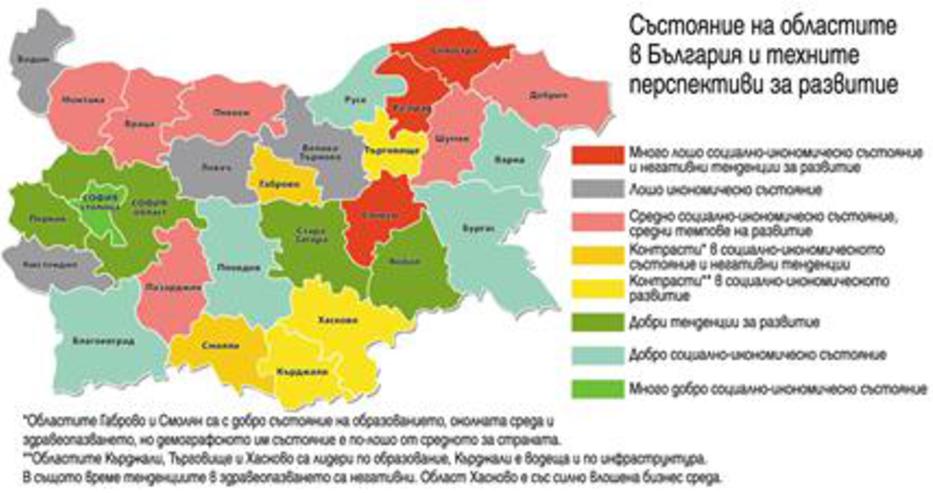 София-столица продължава да е далеч пред другите региони, сочи изследването. БВП на глава от населението в нея - 22 573 лв. годишно, е 2,3 пъти по-висок, отколкото в следващия регион - Стара Загора. В най-лошо социално-икономическо състояние са Разград, Силистра и Сливен, където БВП е 4500-5500 лв. на човек. Най-добре след столицата са развити Варна, Бургас, Пловдив, Благоевград и Русе.
