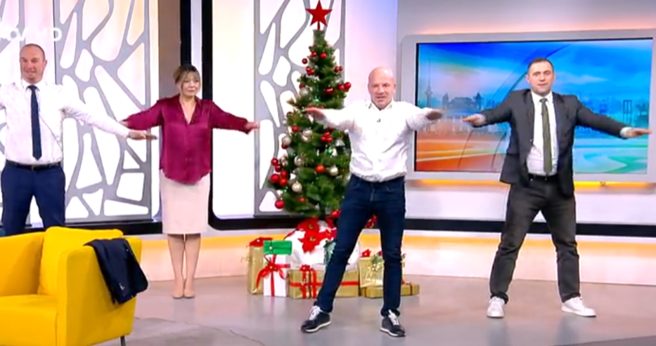 По-късно в сутрешния блок последва нова препратка към соца. Екипът заедно с акробата и зам.-кмет на Ямбол Енчо Керязов игра утринна гимнастика, точно как всички ученици преди 90-те.