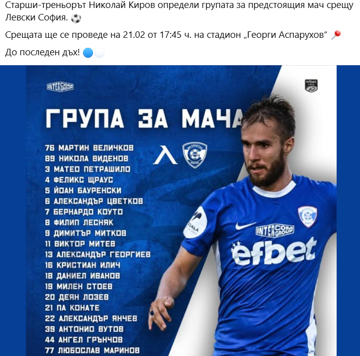 В нея попаднаха всички други 20 налични футболисти, става ясно от информацията на страницата на Спартак във фейсбук.