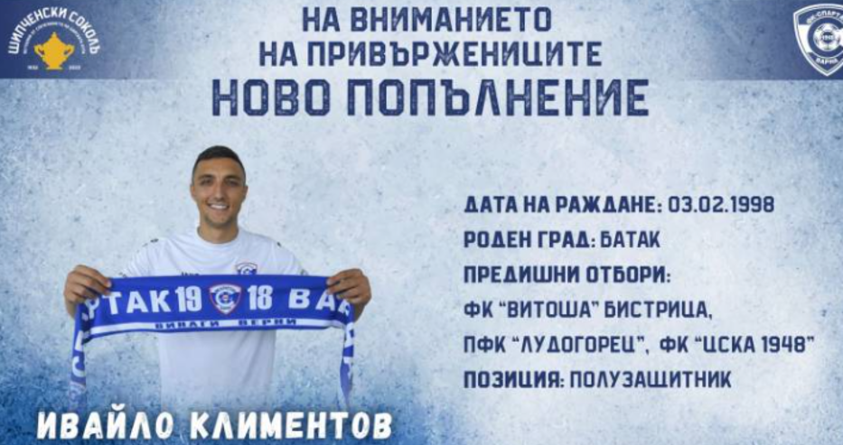 ФК “Спартак” Варна привлече Ивайло Климентов. 24-годишният полузащитник подписа договор със “соколите” за срок от две години.