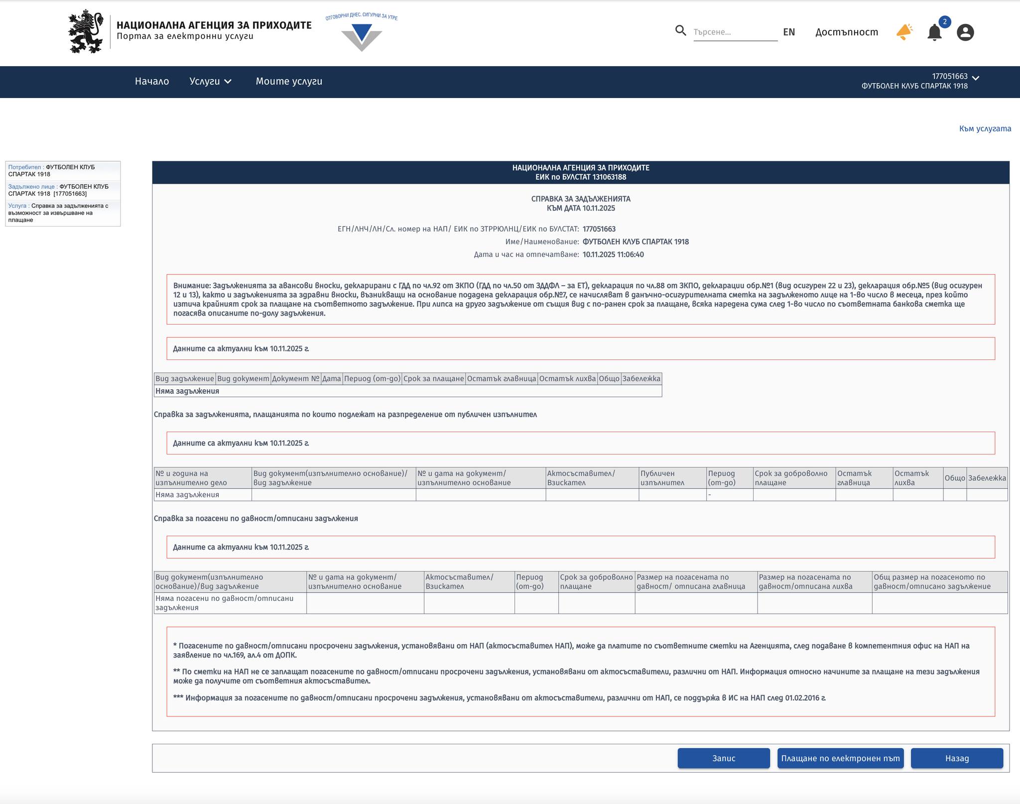 Спартак Варна дължи 0 (НУЛА!) лева към Националната агенция за приходите.