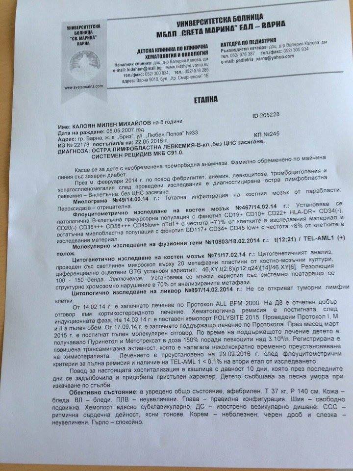 Калоян е на 9 години, от Варна. Води борба с Остра лимфобластна левкемията от две години. Премина геройски серия от химиотерапии и лечения. Ремисия е постигната, но в края на месец май тази година новината за пробив на болестта дойде най-неочаквано за малкия боец и семейството му.