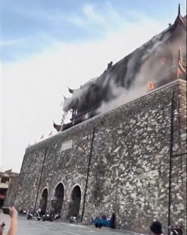 Записи от очевидци, заснети в понеделник (19 май), показват как покривът на историческа кула в китайския окръг Фънян се срутва.