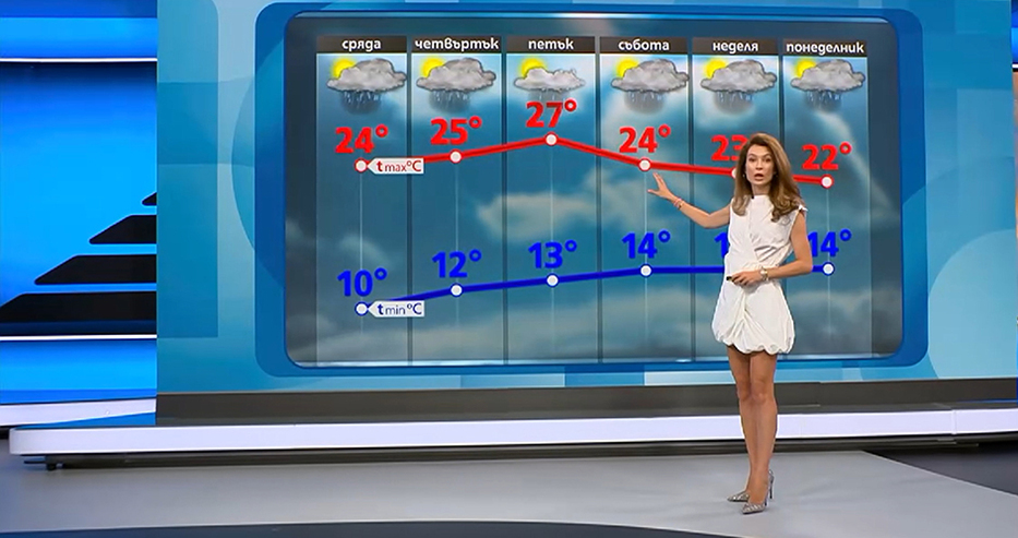 Сутрин ще е спокойно и с повече слънце, а следобед на много места ще се развиват гръмотевични бури. Очакват се кратки но интензивни дъждове, като се повишава опасността от градушки. По-интензивно ще вали в западна и северна България, докато на изток ще има повече слънце и температурите ще достигат до 27 – 28 градуса, завърши синоптичката на Нова телевизия.