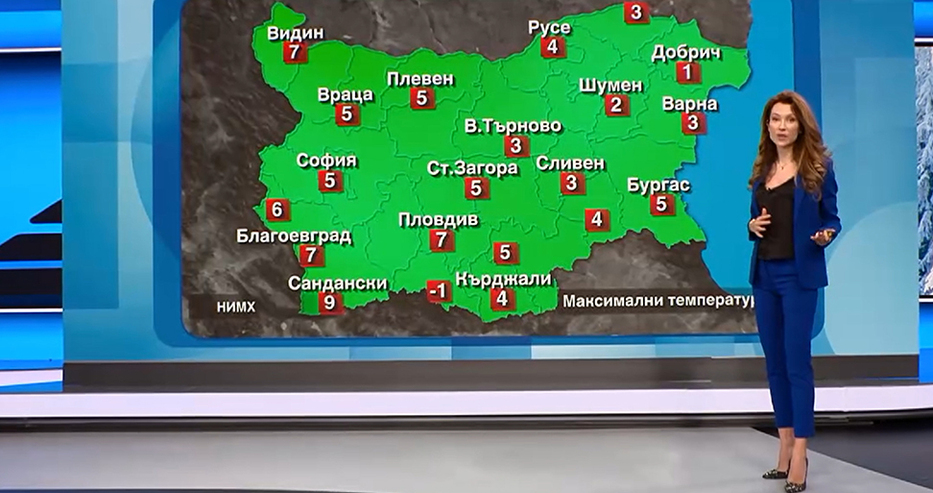 Утре минималните температури навсякъде ще бъдат отрицателни, като очакваме от минус 6 до към минус 1 градуса. Максималните ще бъдат подобни на днешните и ще достигат от градус - два в североизточните части, до към 8 – 9 градуса в района на Петрич и Сандански, съобщи прогнозата за утре синоптичката на Нова телевизия Никол Станкулова.