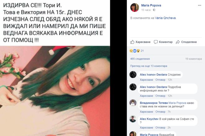 "Издирва се Тори И. !!! Това е Виктория, на 15 г. Днес изчезна следобяд. Ако някой я е виждал или намерил, да ми пише веднага! Всякаква информация е о помощ!!!"