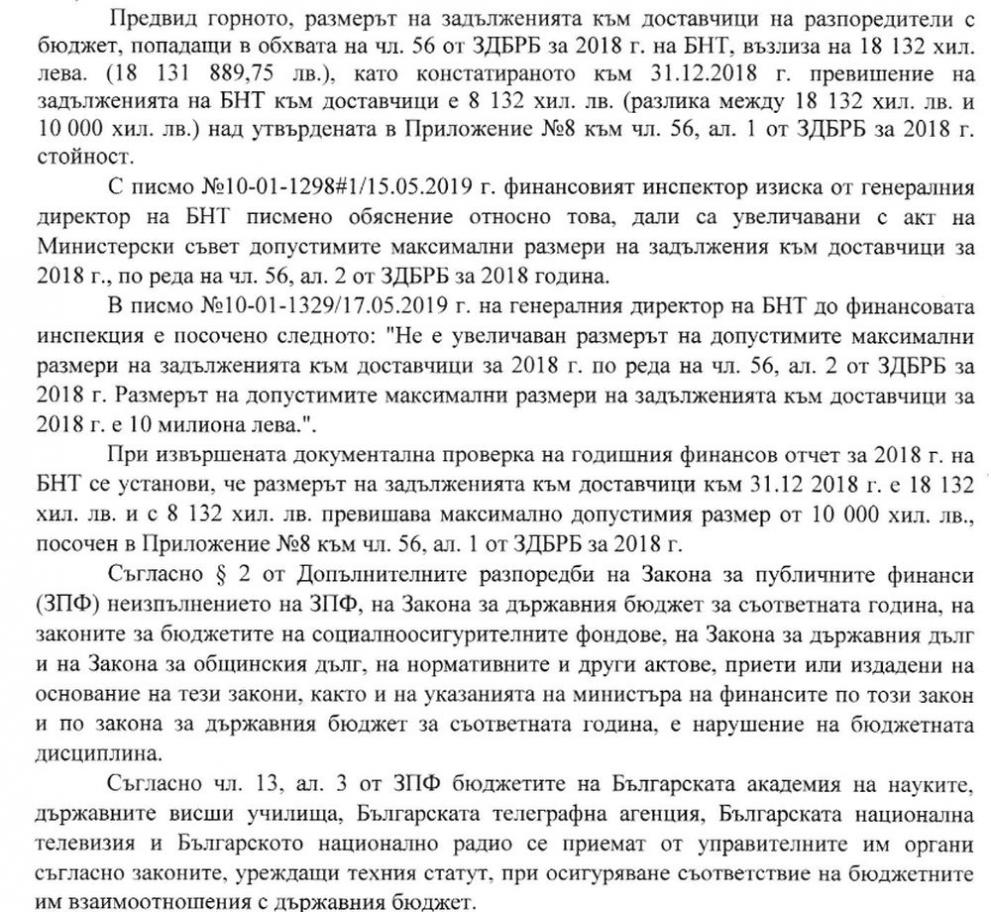 Ревизорите на АДФИ констатират, че в края на декември 2018 г. дълговете на БНТ скачат с цели 241% само за една година, сравнено с борчовете към 31 декември 2017 г.