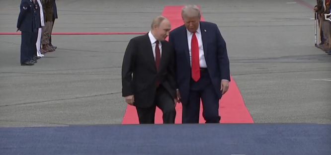Американският президент Доналд Тръмп и руският президент Владимир Путин бяха посрещнати с прелитане на стелт бомбардировачи B-2. Самолетите прелетяха над главите на двамата лидери, докато те се ръкуваха на червения килим във военната база „Елмендорф–Ричардсън” в Анкъридж, Аляска.
