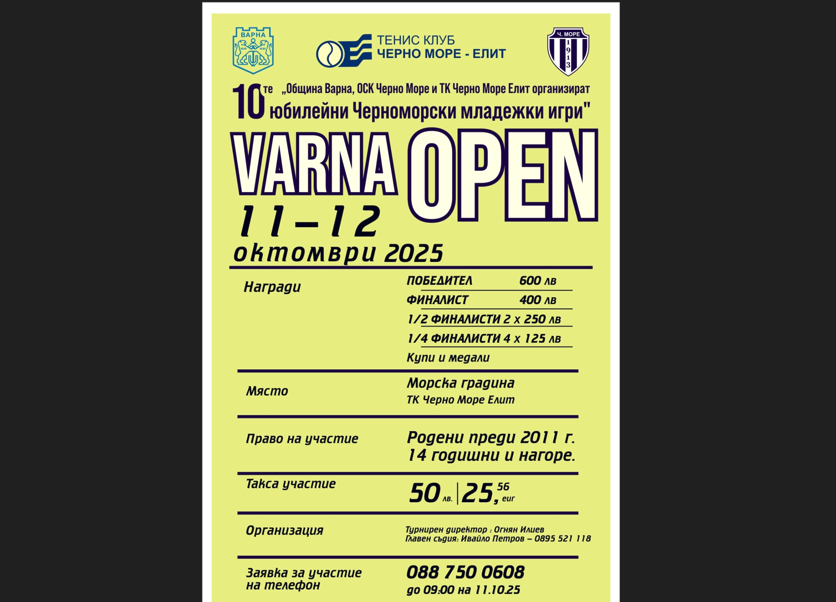 Този уикенд на кортовете в Морската градина на Варна ще се проведе поредното издание на тенис турнира за деца “Varna open” - родени преди 2011 г и по малки. Проявата е част от юбилейното 10-то издание на Черноморските младежки игри и е организирана от ТК „Черно море Елит“ и ОСК „Черно море“, с подкрепата на Дирекция „Спорт“ към Община Варна.