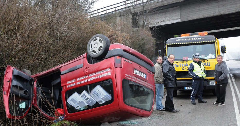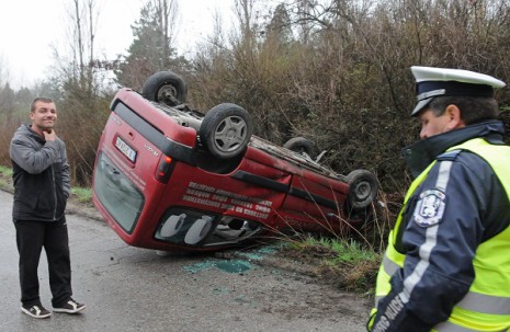 БМВ с турска регистрация стана причина за обърнато "Пежо" на пътя Хасково - Димитровград тази сутрин. В посока Хасково се движел Деян Георгиев със служебен автомобил "Пежо Партнер". Малко преди детелината за качване на международен път Е-80 колата му била застигната и задмината от сребристо БМВ. Секунда по-късно обаче турският водач се престроил в дясно, рязко набил спирачки, за да намали достатъчно и да хване отбивката за международния път. Деян натиснал спирачките и завъртял волана рязко на дясно, но колата му се преобърнала по таван. Водачът и неговия спътник се разминали само с уплаха.