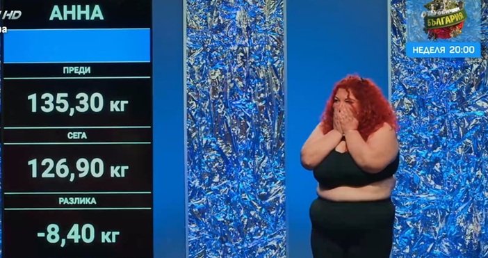 Невероятните 8,4 кг само за седмица свали 30-годишната Анна от Стара Загора в предаването по бТВ "На кантар". Това се случи само със здравословен режим и двигателна активност.