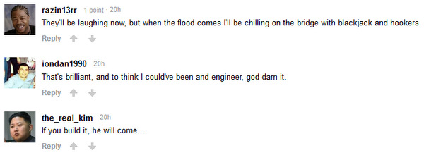 В свободен превод те гласят: "Сега може да се смеете, но когато наводнението дойде, аз ще си стоя спокойно на моста с блекджек и проститутки", "Това е брилянтно, кара ме да си мисля, че и аз мога да съм инженер.", "Ако го построиш, то ще дойде...".