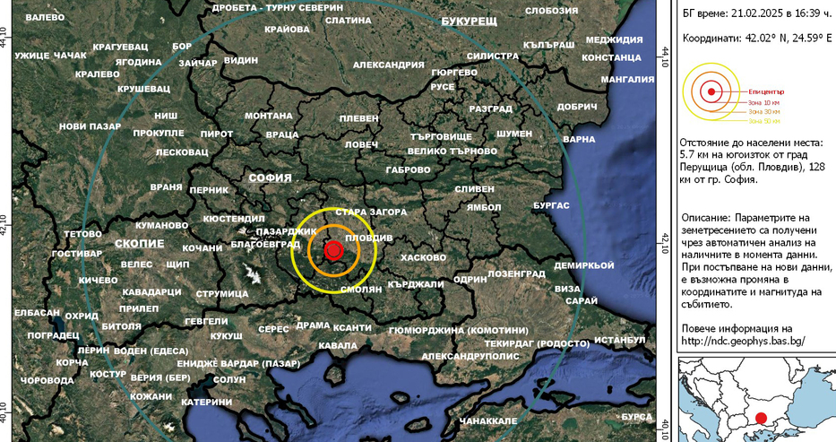 Трусът, регистриран в 16,39 ч., е с епицентър на 25 км от Асеновград, на 100 км от Стара Загора и на 130 км от София.