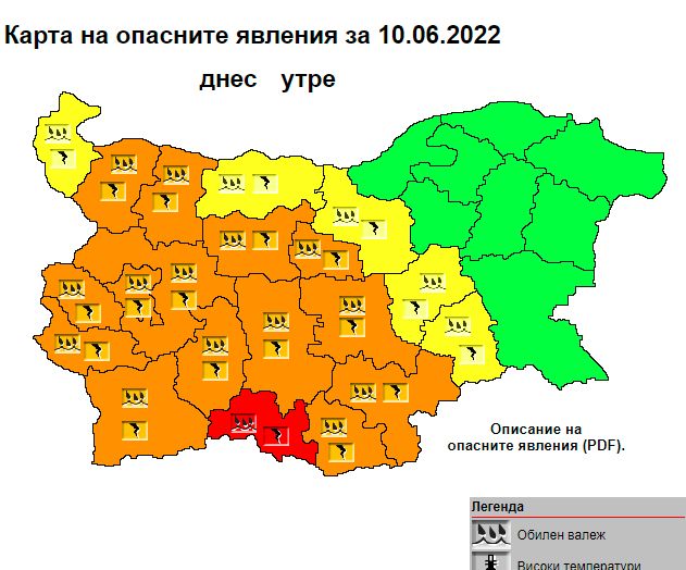 Очаква се опасно време, затова от НИМХ обявиха червен код за една област и оранжев за други 12. Очакват се интензивни валежи главно следобед. Ще има гръмотевични бури и локални градушки. Явленията ще продължат и през нощта срещу събота.