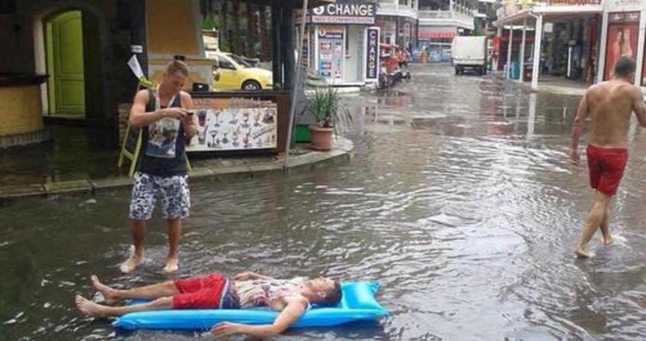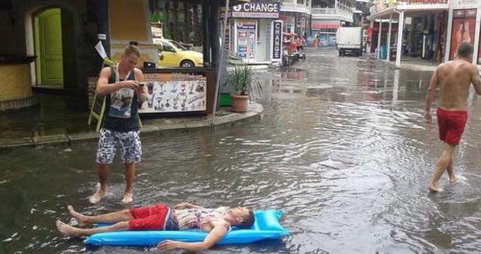 Изобретателни плажуващи в Несебър намериха алтернативен начин за забавление, като използваха наводнените улици на града, за да поплуват с надуваем дюшек, видя inews.bg..