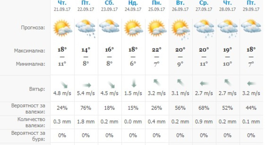 В петък времето ще се задържи хладно и ветровито. Ще има променлива, често значителна облачност, но само на отделни места ще превали слаб дъжд. Минималните температури ще са между 8° и 13°, а максималните - между 17° и 22°.