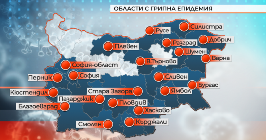 Грипът продължава да настъпва. Повече от половин България е в епидемия. От днес тя е в сила за областите Разград и Велико Търново, а от утре ще бъде обявена и в Плевен и Русе. Областите Благоевград, Кюстендил и София -град ще бъдат в епидемия от понеделник. Учениците излизат в грипна ваканция.