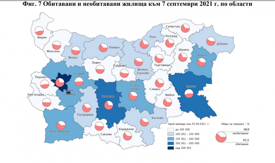 В регионален аспект - към 2021 г. най-висок е делът на необитаваните жилища в областите Видин (55.4%), Бургас (53.7%) и Перник (53.6), а най-нисък е в София - 30.3%, и област Пловдив - 31.1%.