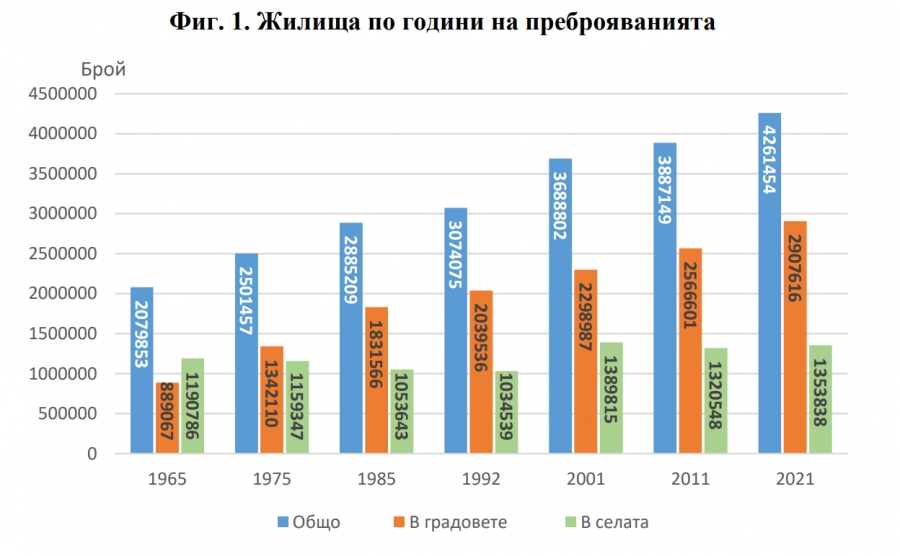 Това гласят най-новите оповестени данни от Преброяване 2021, които бяха публикувани на 15 юни 2023 г. Прави впечатление, че в десетте години между това преброяване и предходното от 2011 г. населението на България се е стопило с 844 781 души, а броят на жилищата е продължил да расте.