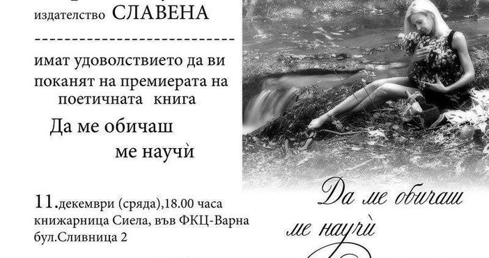 Две поетеси, един талантлив актьор и млада художничка ще споделят своята свързаност с любовта през призмата на дебютната стихосбирка "Да ме обичаш, ме научи ". Варненката Мариела Русева е автор, Милена Белчева, Стоян Радев и Магдалена Пюскюлева ще бъдат съучастници в представянето й пред публика. Премиерата ще се състои в сряда от 18 часа в кафе-книжарница "Сиела" във ФКЦ.