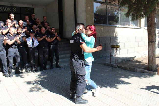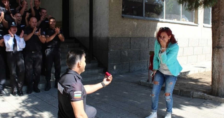 Двамата влюбени споделиха, че са се запознали преди 1г. на общото си работно място в Бургас, съобщи 24 часа. Николина призна, че не е знаела и не е била предварително подготвена за изненадващото предложение за брак на любимия си. 85 бъдещи жандармеристи, завършили успешно обучението си в полицейската школа на МВР в Пазарджик, положиха клетва в четвъртък. Те ще бъдат разпределени в подразделения на жандармерията в София, Бургас и Монтана.