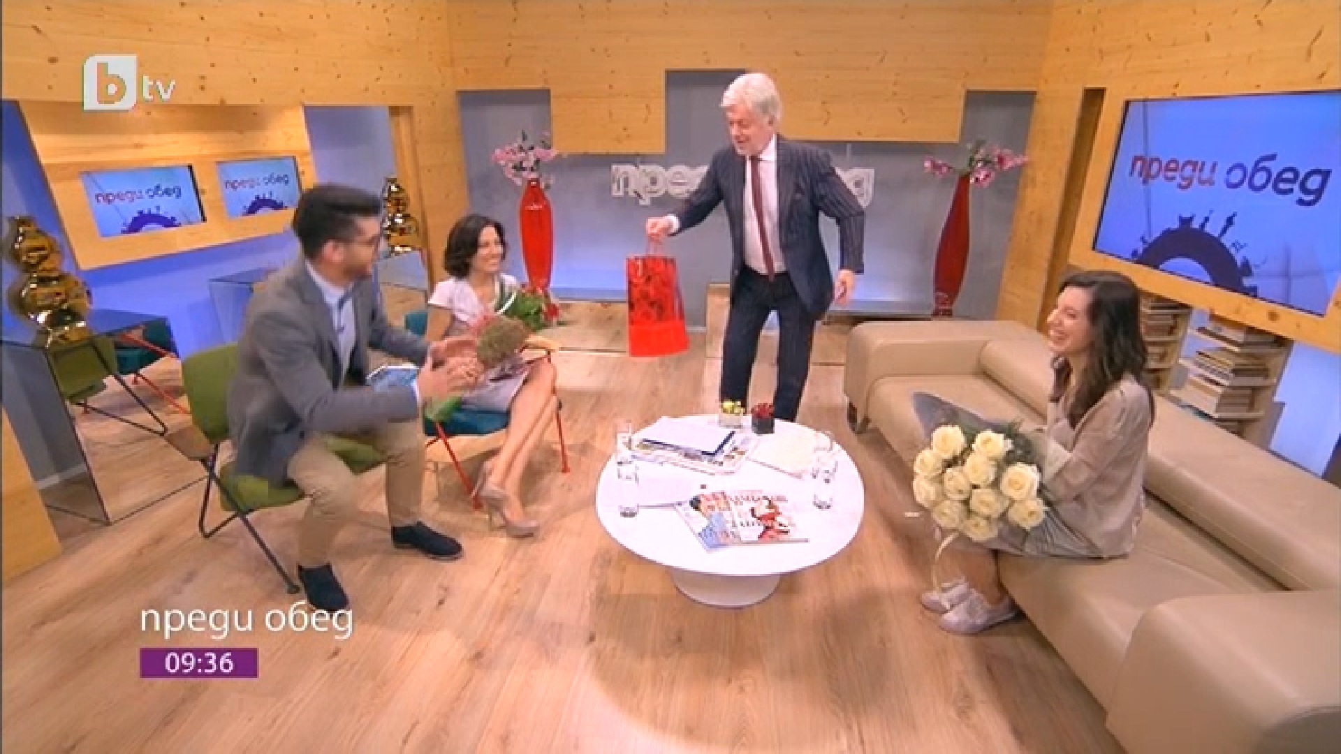 По този повод като истински джентълмен той извади два огромни букета, които подари на дамите, а за актьора бе подготвил питие, което е над 15 и 18-годишно.